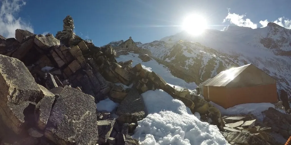 Obóz zlokalizowany jest na otwartym terenie otoczonym skałami w postaci budynku o solidnej zabudowie. Wewnątrz budynku znajduje się pomieszczenie sypialne z łóżkami piętrowymi. Każde łóżko posiada materac i cienki koc. W centralnej części budynku mieści się pomieszczenie jadalne, a następnie kuchnia i pomieszczenie dla przewodników. Do budynku z zewnątrz przylega toaleta i bolier na deszczówkę.